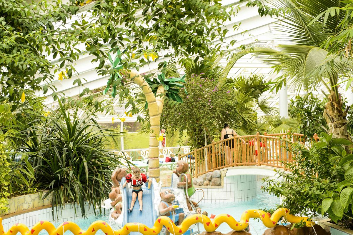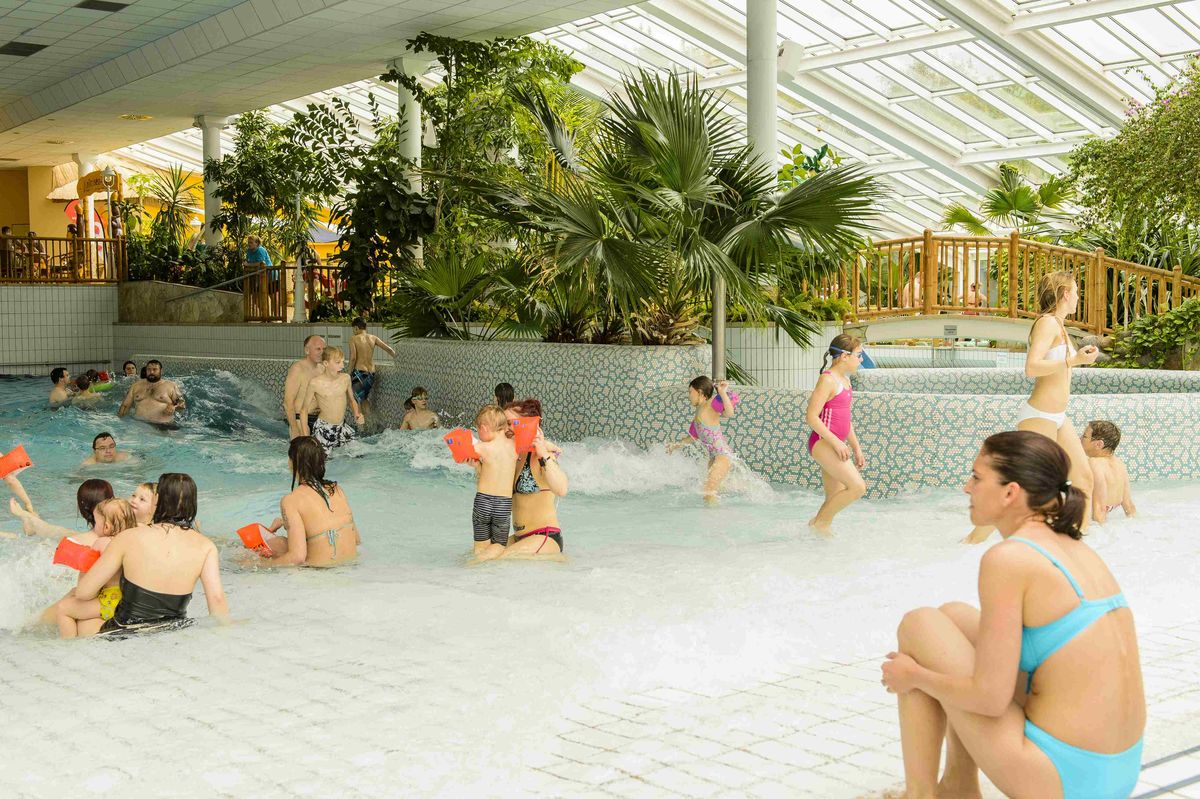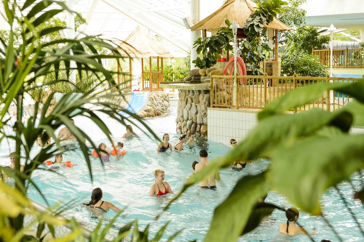 Baden unter Palmen bei angenehmen 28 °C, Karibikwellen, Whirlpools, eine Reifen- und Riesenrutsche, die Knirpsenwelt,